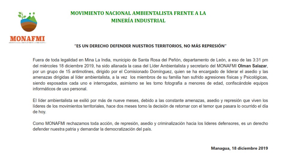 Miembros del MONAFMI denuncian los hechos ejecutados por el comisionado Fidel Domínguez, jefe de la policía en León, pues la tarde del miércoles 18 de diciembre allanaron su casa, ubicada en Mina La India, mientras que su familia fue agredida de manera física y psicológica y sometidos a interrogatorios. Los agentes tomaron fotos y confiscaron dispositivos móviles de su vivienda.
